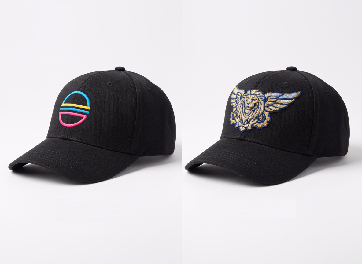 Embroidery, 3D puff, patches, color matching, and custom branding options available.