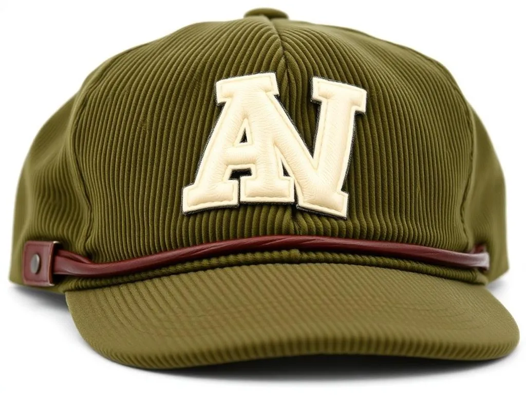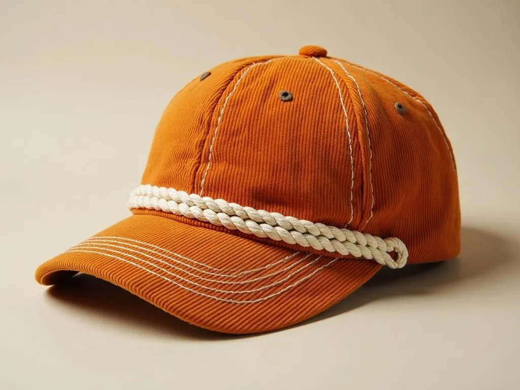 The ultimate vintage combo. A Corduroy hat with a contrasting Braided Rope across the visor. This pairing is currently a top seller in the lifestyle market, evoking a 70s surf/ski vibe.