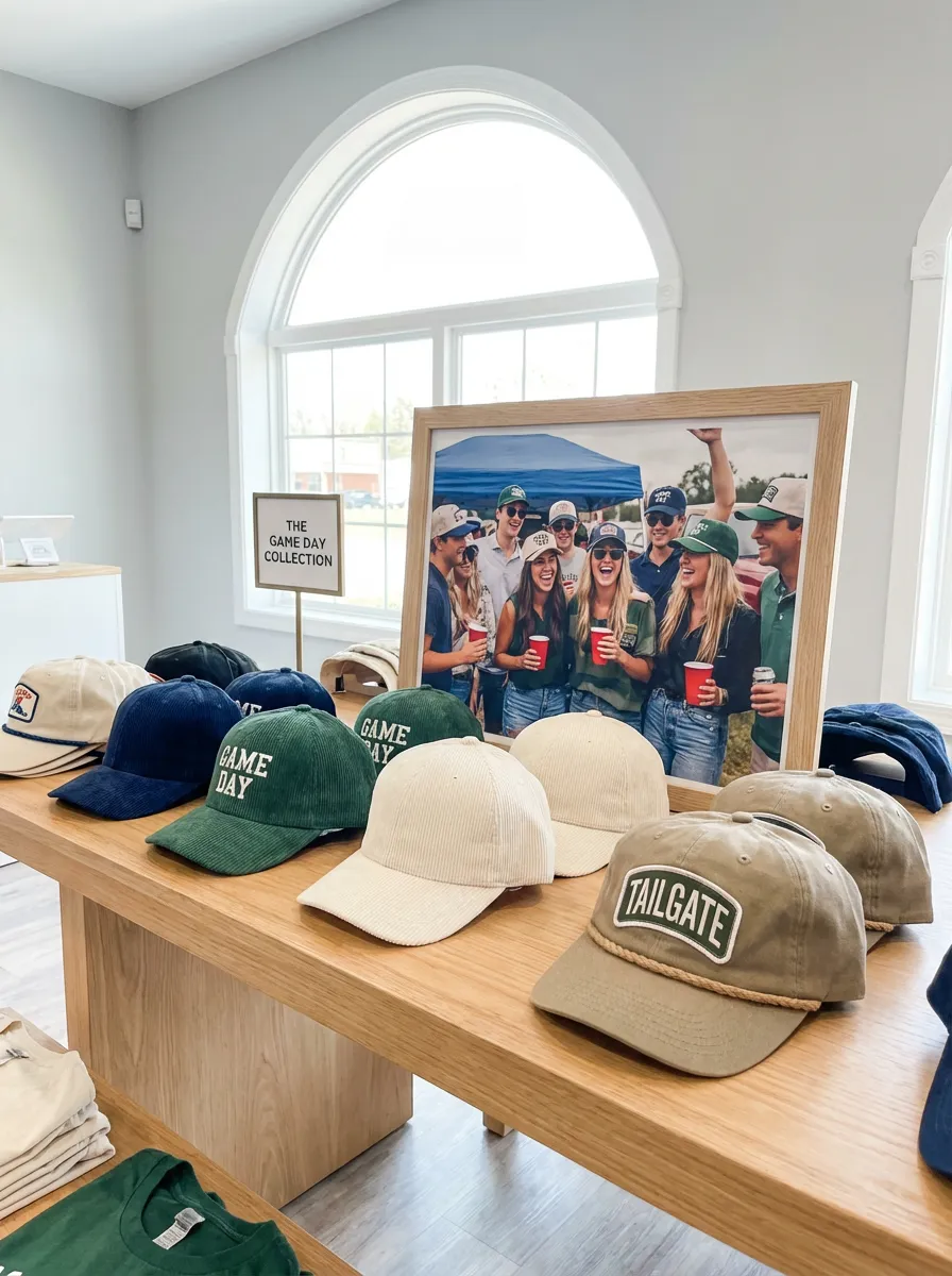 Quick-turnaround “Champions” hats. Usually screen-printed foam truckers or simple embroidered caps produced rapidly to celebrate a bowl game victory or league title.