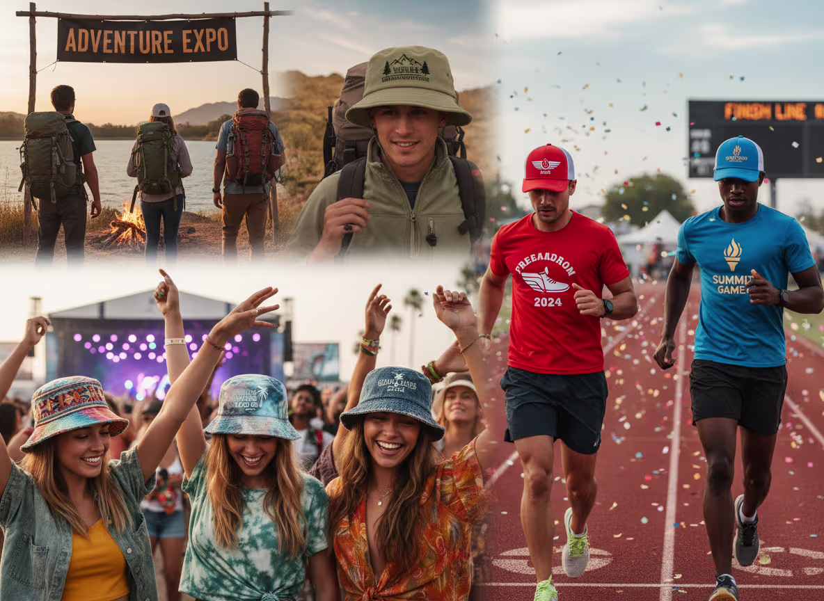 Custom commemorative hats for music festivals, exhibitions, and sports events. Different events suit different hat styles: music festivals are best suited to 5-panel hats and bucket hats, sports events are best suited to baseball hats, and outdoor activities are best suited to bucket hats. Support event logos, dates, and other custom elements. Small batch fast delivery.