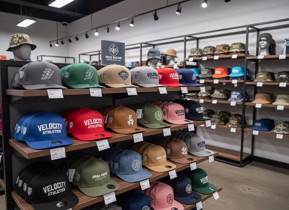 Custom brand logo hats for retail stores as products. Can choose hat styles based on target customers: sports stores choose baseball hats, fashion brand stores choose 5 panel hats, outdoor stores choose bucket hats. Multi-style product lines offer a richer range of retail choices. Need consistent quality and accurate color matching.