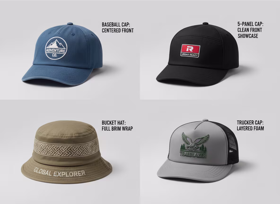 Different hat styles have different optimal logo positions: baseball hats’ center front panel has largest area, ideal for main logos; bucket hats’ full brim design offers wider logo viewing angles; 5 panel hats’ simple front panel makes logos more prominent; trucker hats’ foam front panel creates layered logo effects. We provide best position recommendations based on your selected hat style.